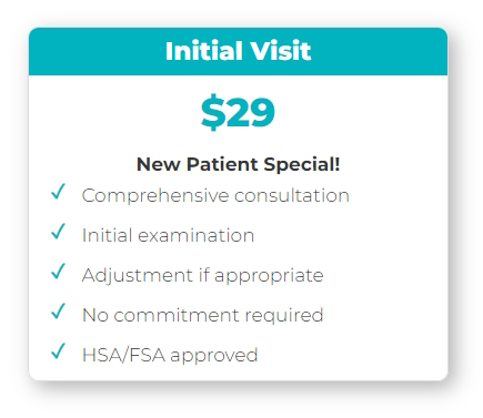 Includes your consultation, exam and first adjustment. Really. There’s no hidden fee, no obligation for further visit purchases, and no surprise bill later.
